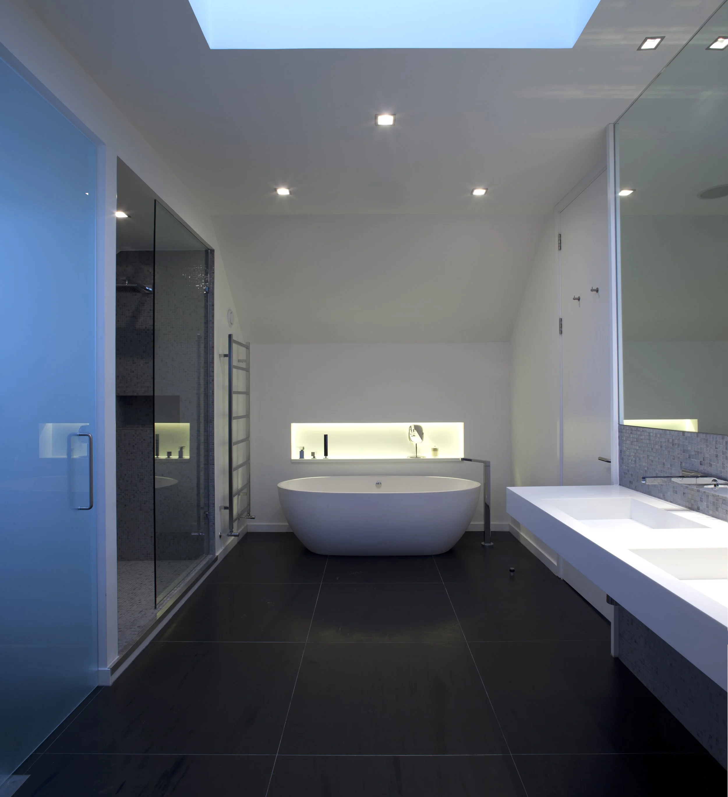 This new-build, low-carbon house, is situated on a conventional residential street in Wimbledon, London. Whilst there are references of 20th-century suburban architecture externally, the interior is modernist with an emphasis on open space, light and sharp minimalist detailing.